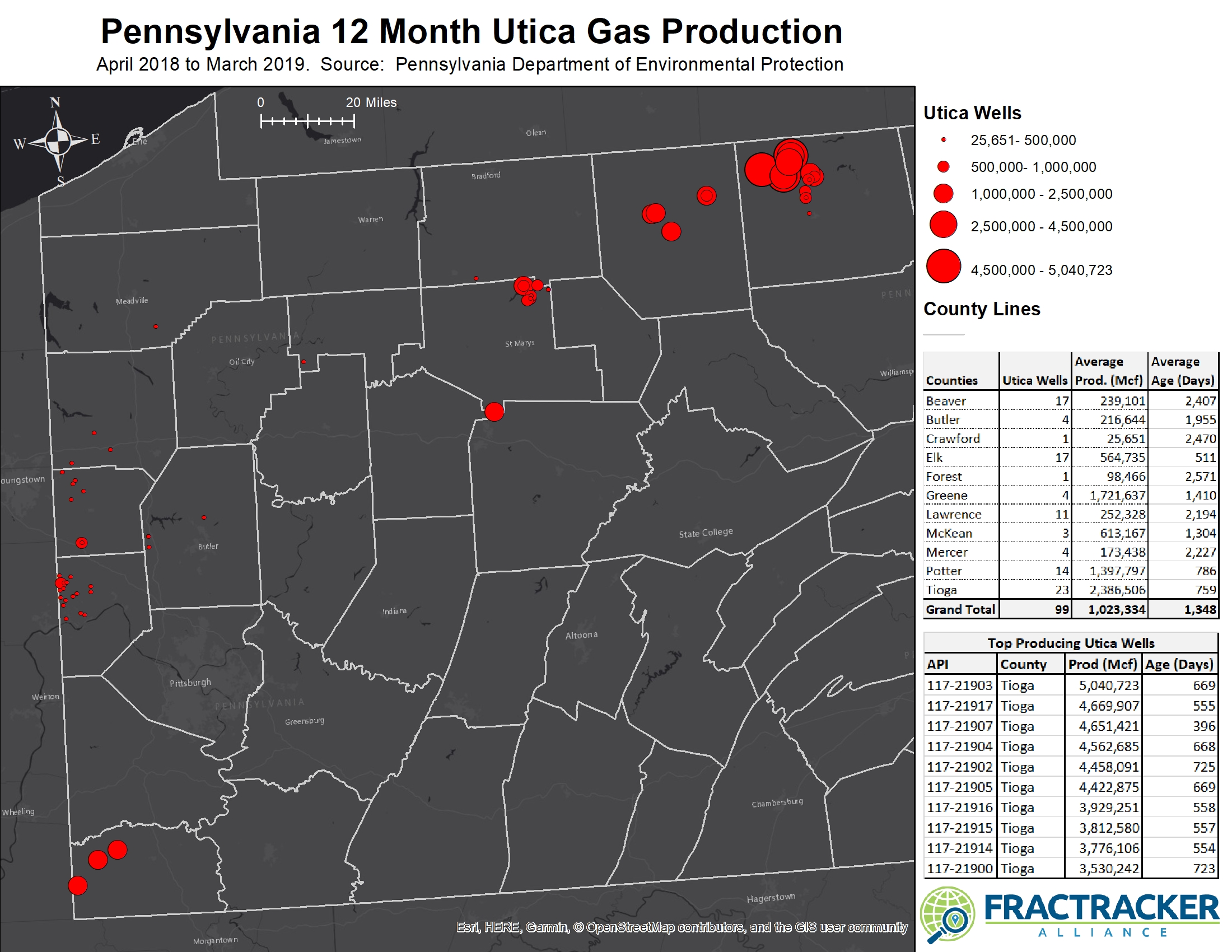 Figure 4 – Producing Utica wells in Pennsylvania. Note that the cluster of heavily producing wells in Tioga and Potter Counties near the New York border are mostly young wells where higher production would be expected. Click on image for full sized view.