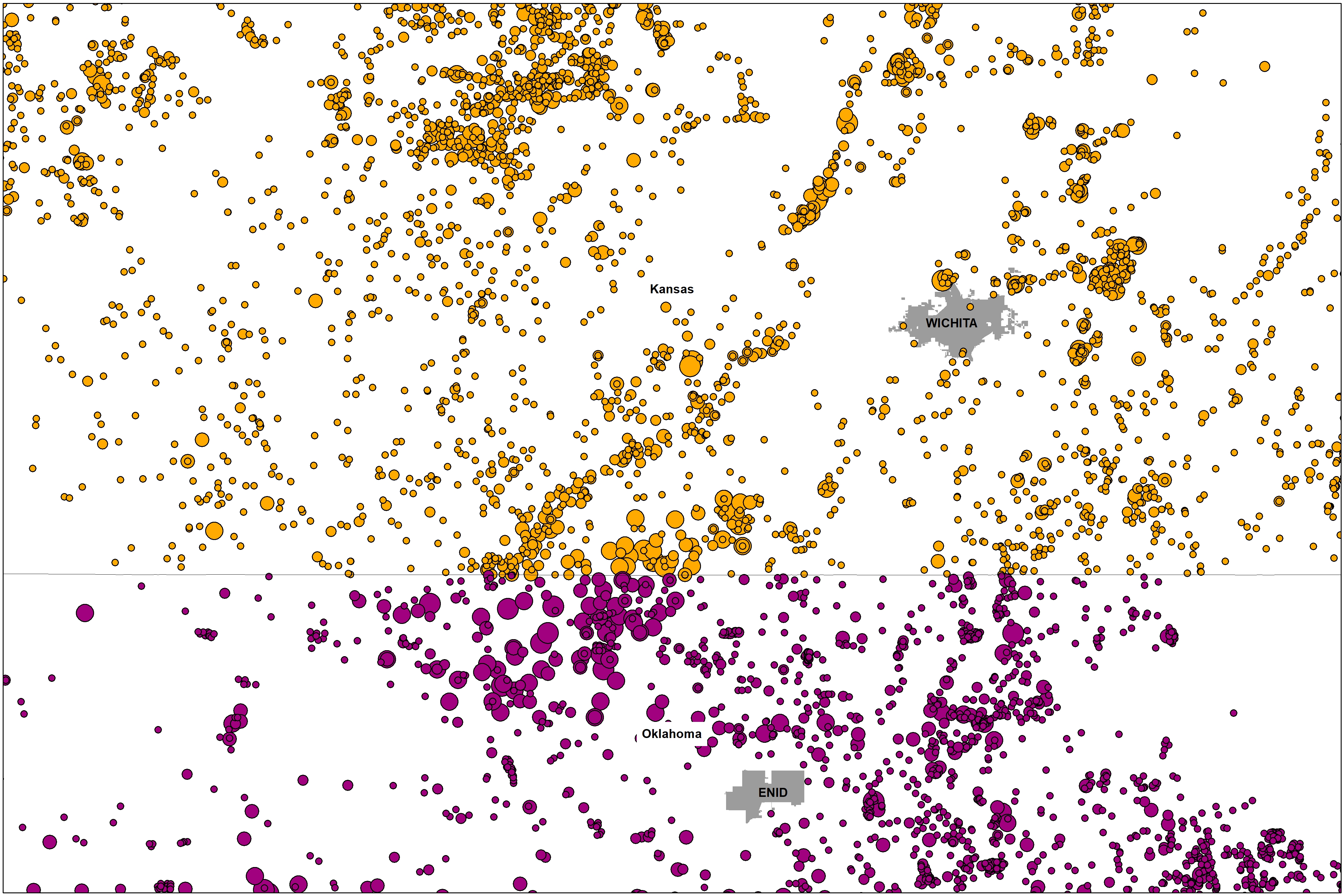 It is critical that we analyze the Great Plains fracking waste ecosystem across state lines. There are several reasons for this, including the proximity of Kansas’ most active Class II wells to the Oklahoma border (Figure 2) and the potential for the KCC to use enhanced oil recovery wells in Kansas to dispose of Oklahoma’s fracking waste.