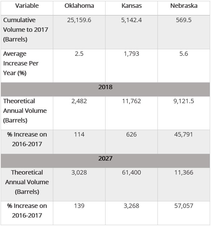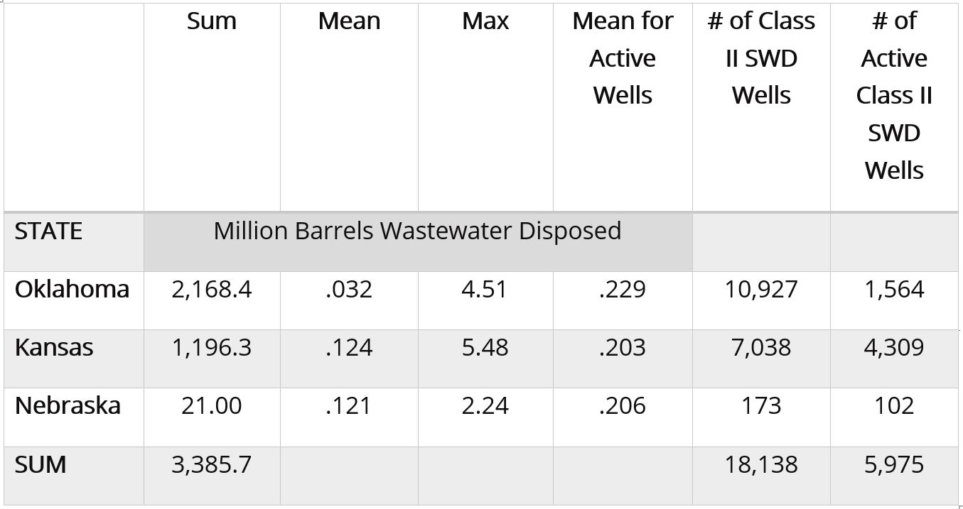 Table 1, below, breaks down the volumes of oil and gas wastewater disposed in Oklahoma, Kansas and Nebraska. Volumes are measured in million barrels, with one barrel equivalent to 42 gallons. The number of Class II SWD (salt water disposal) injection wells in these states is separated to show the total number of wells permitted verse the number of wells that were active (receiving waste).