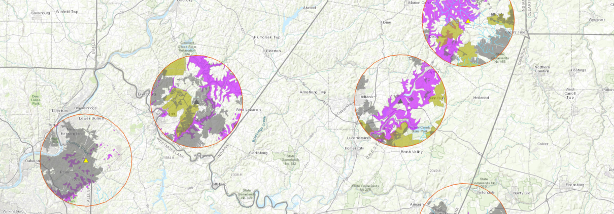 Pennsylvania has numerous data sources for oil and gas, but they are not always in agreement. To account for this, we have mapped SWDs (and a five mile buffer around them) from two different data sources in the map below. The first source is a subset of SWD wells from a larger dataset of oil and gas locations from the DEP’s mapping website. The second source is from a Waste Facility Report, represented in pink triangles that are offset at an angle to allow users to see both datasets simultaneously in instances where they overlap.