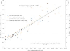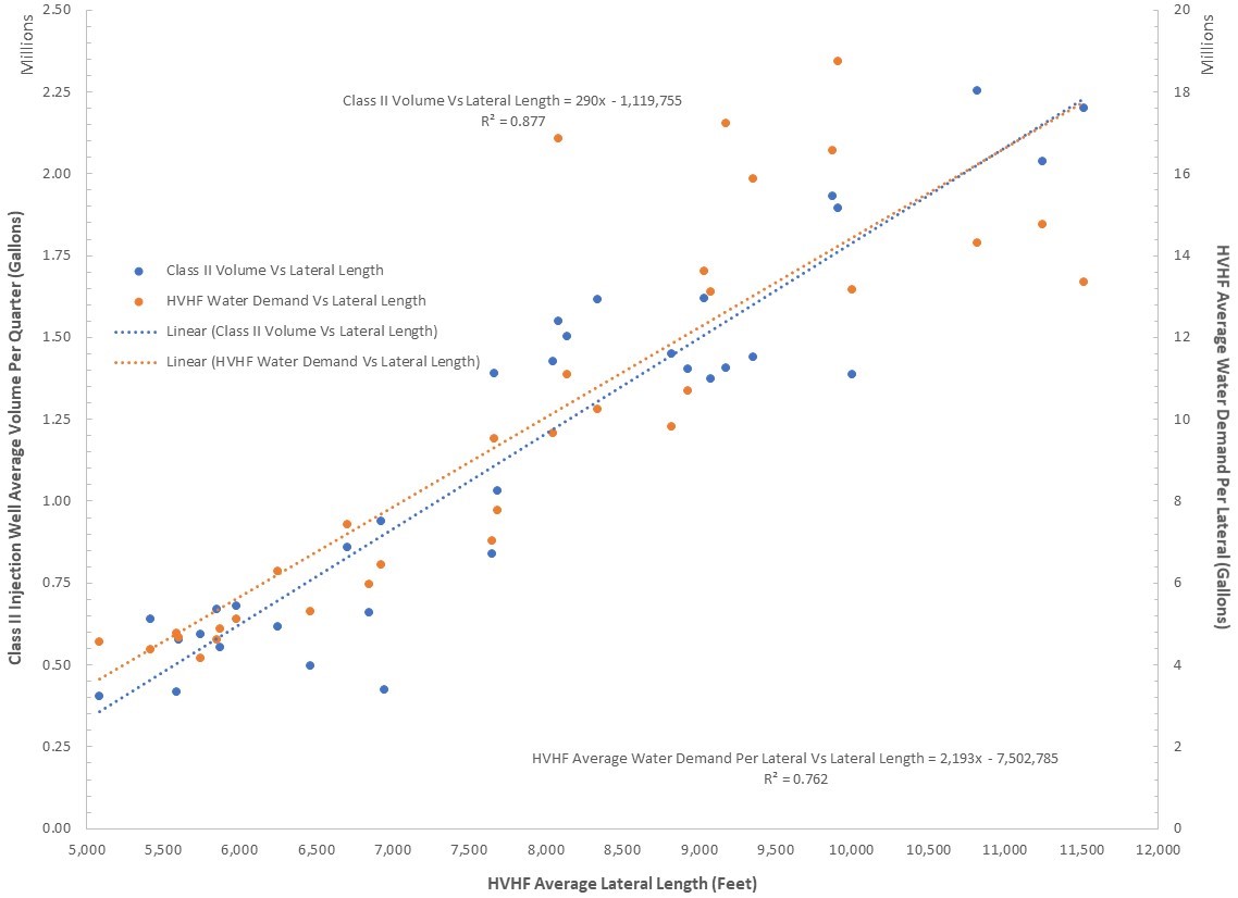 This lateral length increase substantially increases water demand per lateral. It also impacts Class II well disposal rates. The increase accounts for 76% of the former and 88% of the latter when graphed against each other (Figure 13).