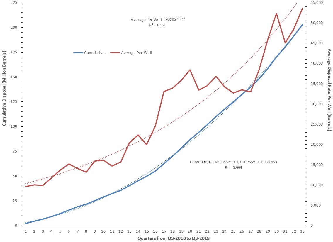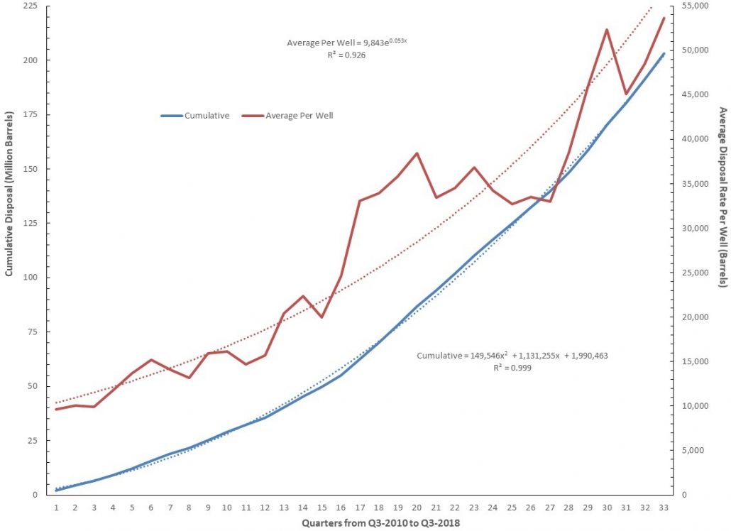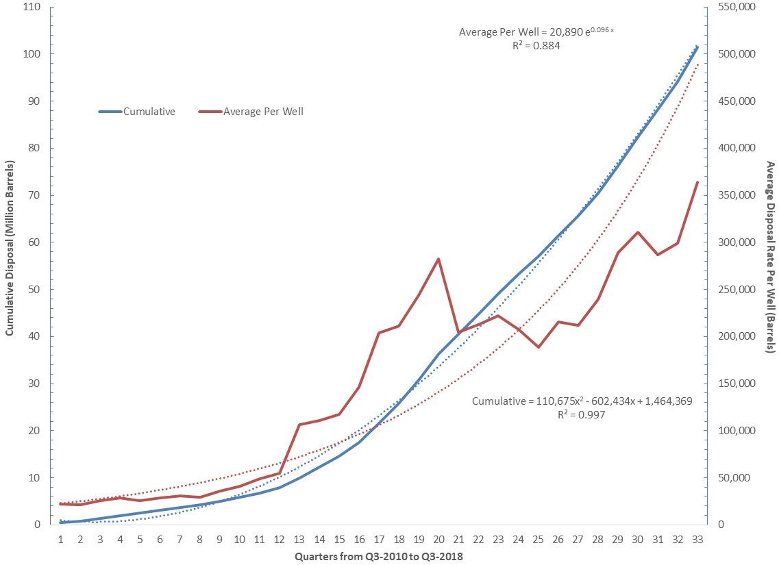 We graphed average per well (barrels) and cumulative (million barrels) disposal rates from Q3-2010 to Q3-2018 for these wells. The data shows an average increase of 24,822 barrels (+1.05 million gallons) per well, each year.