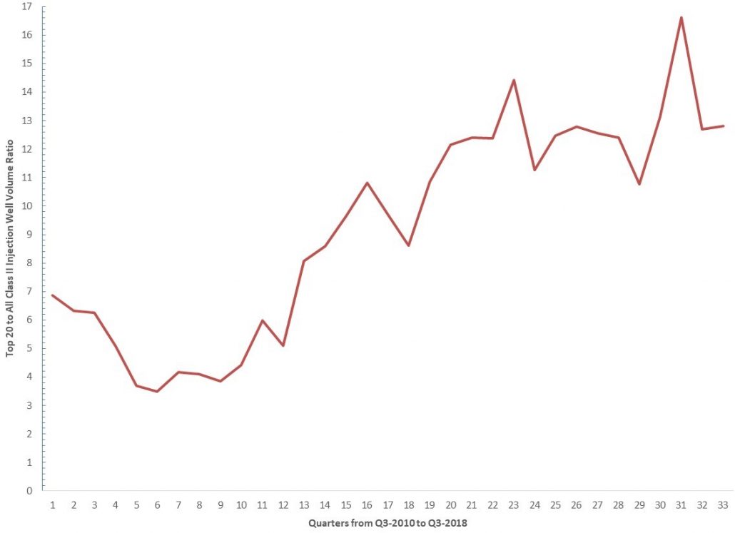 A deeper dive into the data reveals that the top 20 most active Class II wells are accepting more waste than ever before: an astounding annual per well increase of 728,811 barrels (+30.61 million gallons) or a 230% per year increase (Figure 10). This divergence resulted in the top 20 wells disposing of 4.95 times the statewide average between Q3-2010 and Q2-2013. They disposed 13.82 times the statewide average as recently as Q3-2018 (Figure 11).