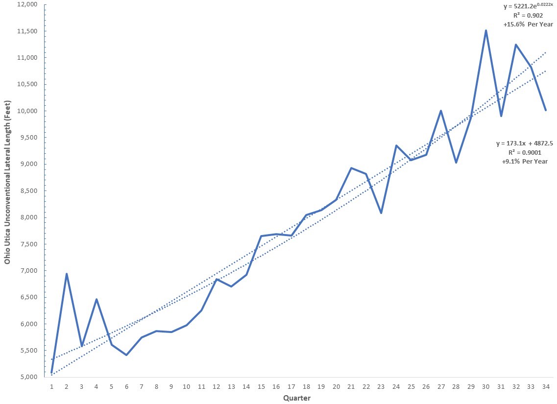 The above trends reflect an equally disturbing trend in lateral length. Ohio’s unconventional laterals are growing at a rate of 9.1 to 15.6%, depending on whether you buy that this trend is linear or exponential (Figure 12). This author believes the trend is exponential for the foreseeable future. Furthermore, it’s likely that “super laterals” in excess of 3-3.5 miles will have a profound impact on the trend. (See The Freshwater and Liquid Waste Impact of Unconventional Oil and Gas in Ohio and West Virginia.)