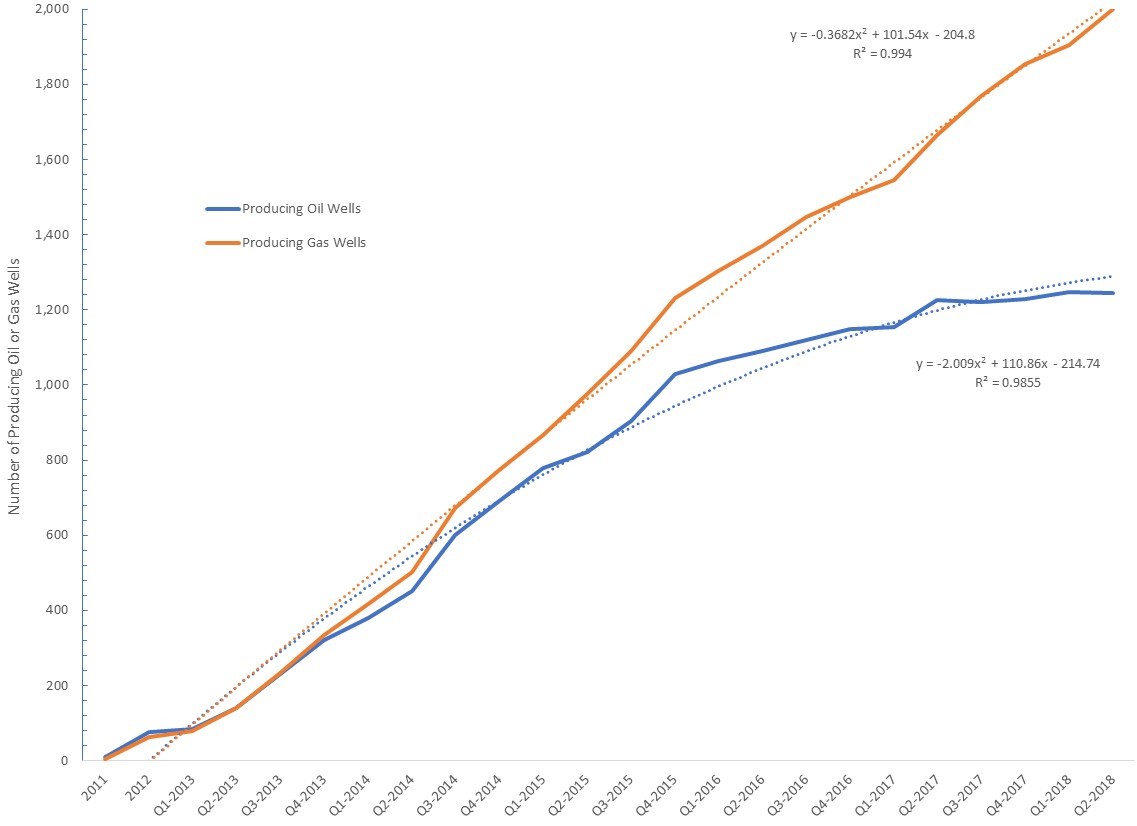 Figure 4. Producing oil and gas wells as a percentage of permitted wells in Ohio’s Utica Shale Basin from 2011 to Q2-2018