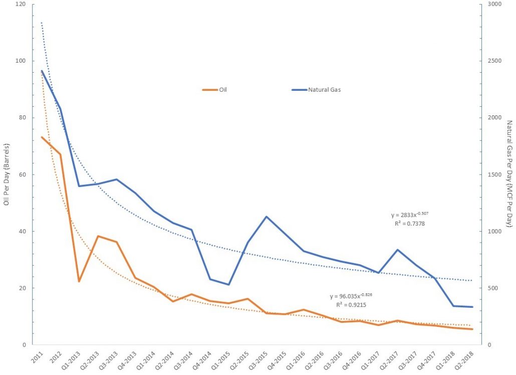Figure 5. Average daily oil and gas production decline curves for the above seven hydraulically fractured laterals in Ohio’s Utica Shale Basin, 2011 to Q2-2018