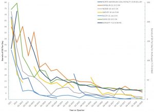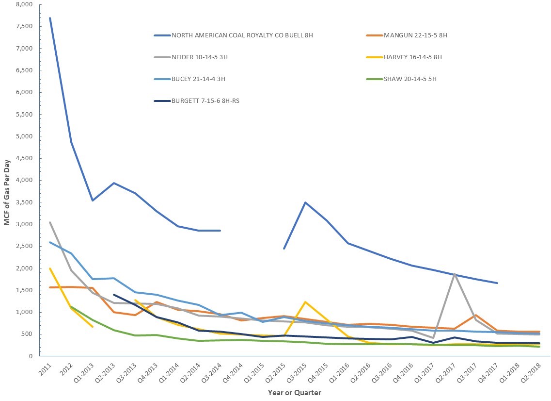 Figure 7. Natural gas production decline curves for seven hydraulically fractured laterals in Ohio’s Utica Shale Basin from 2011 to Q2-2018