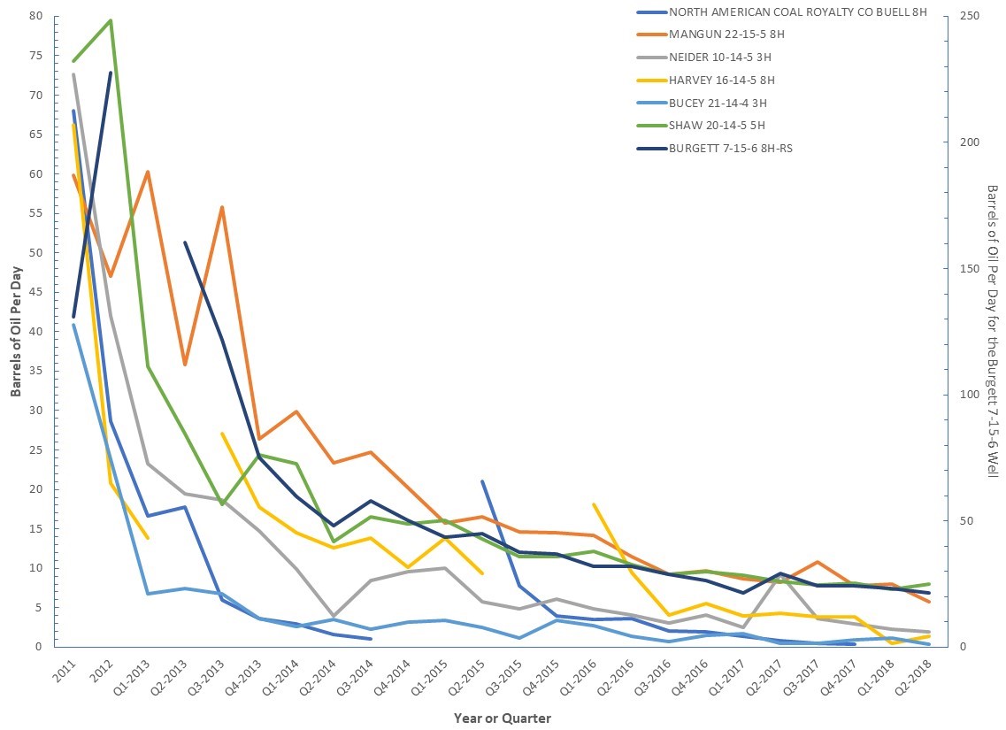 Figure 6. Oil production decline curves for seven hydraulically fractured laterals in Ohio’s Utica Shale Basin from 2011 to Q2-2018