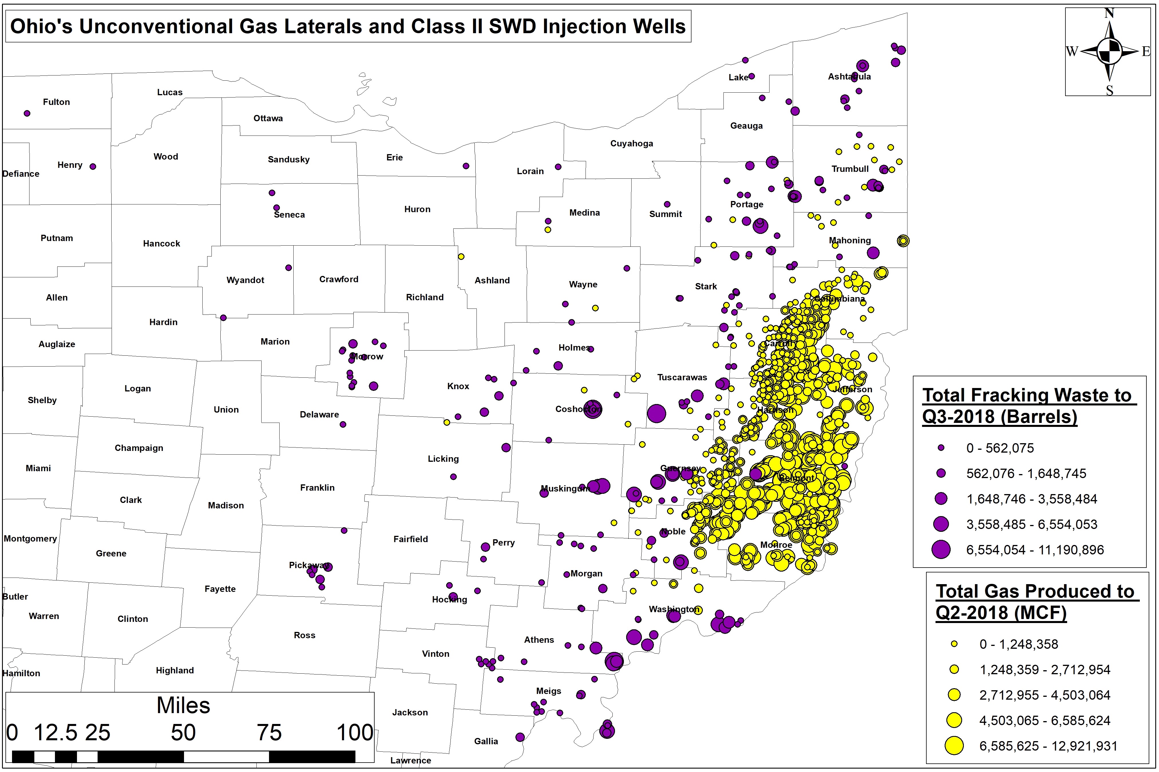 Figure 8. Ohio’s unconventional gas laterals and Class II salt water disposal injection wells. Weighted by cumulative production and waste disposal volumes to Q3-2018.