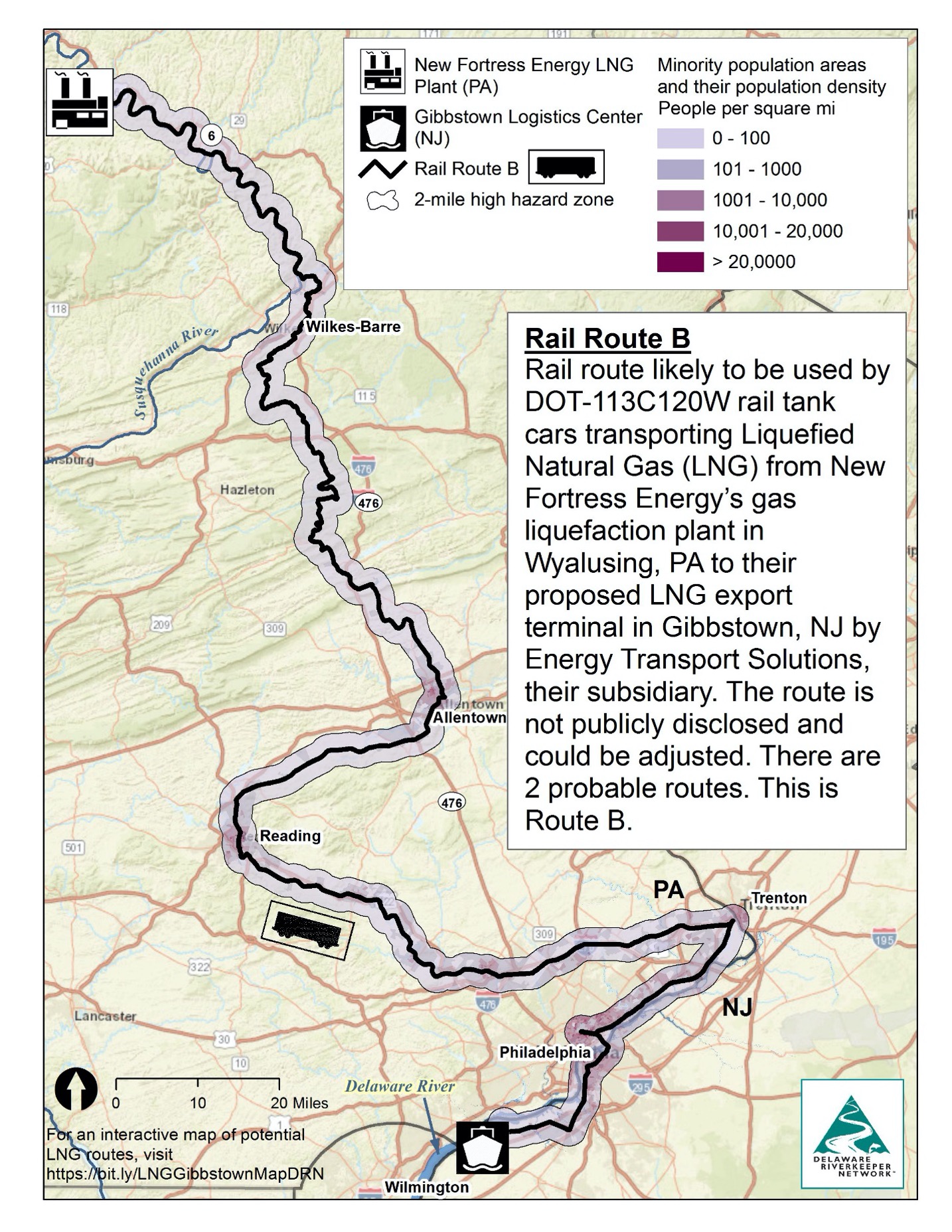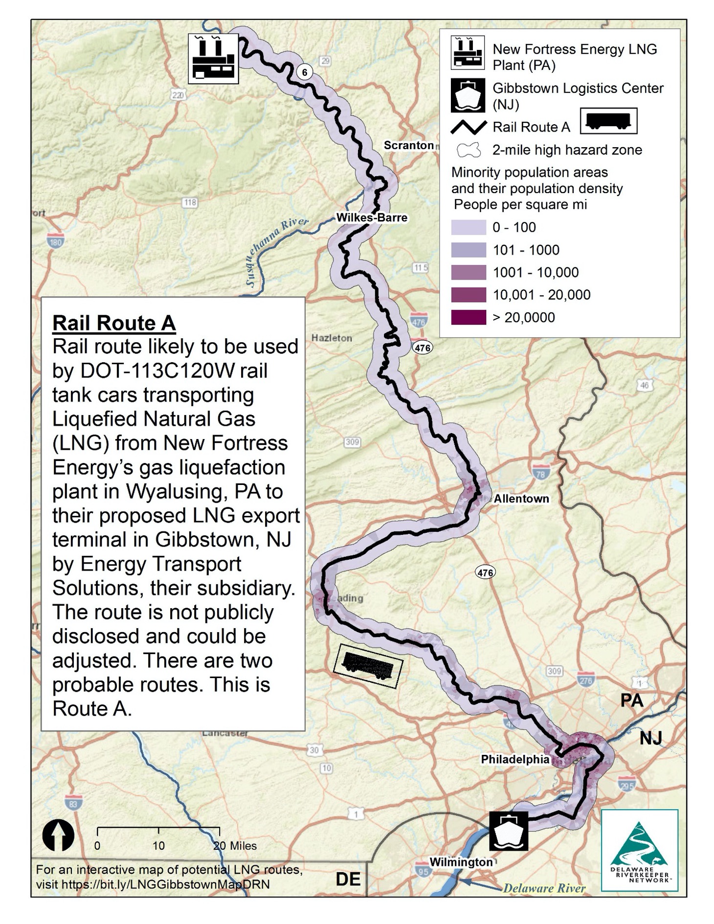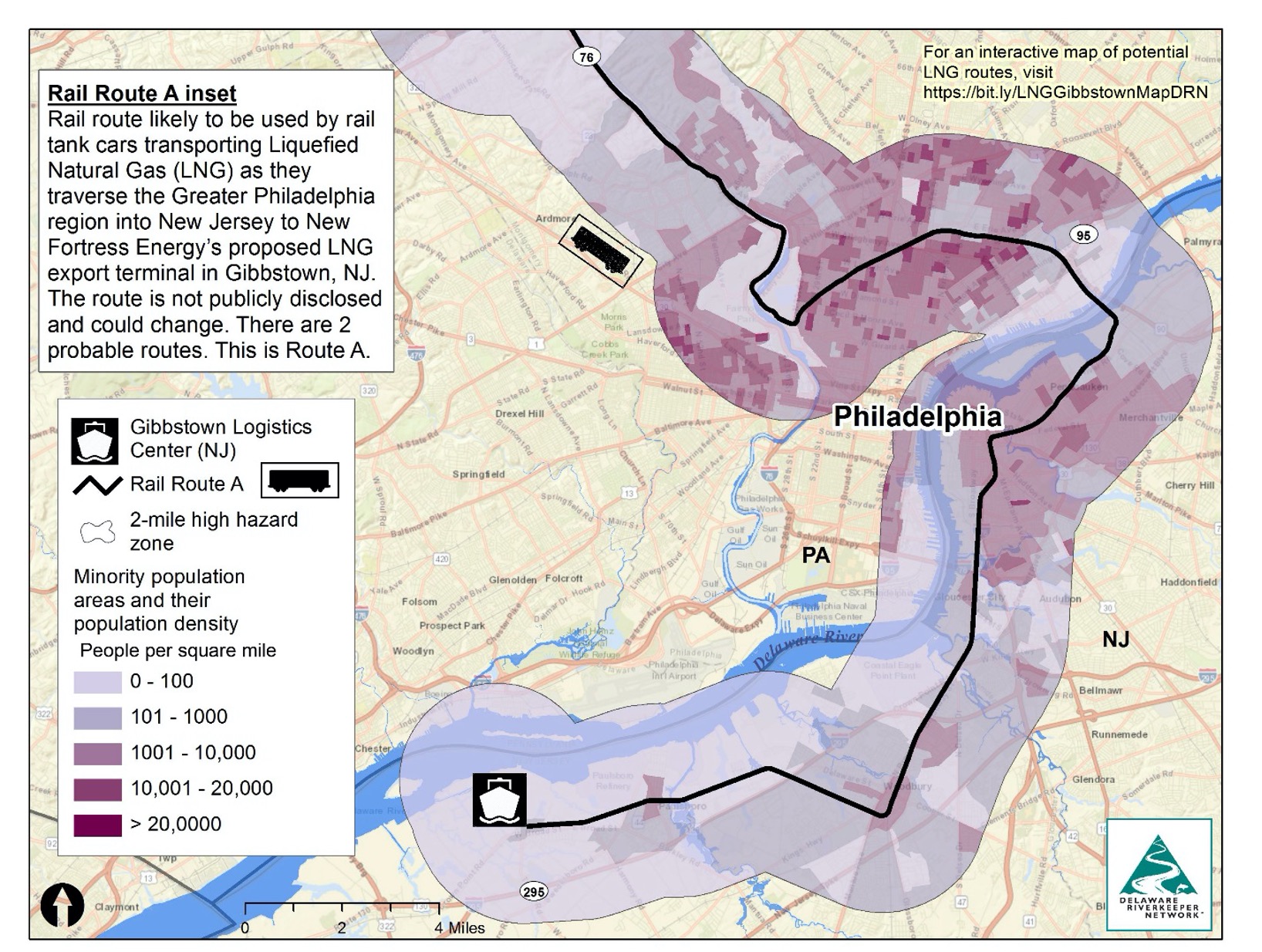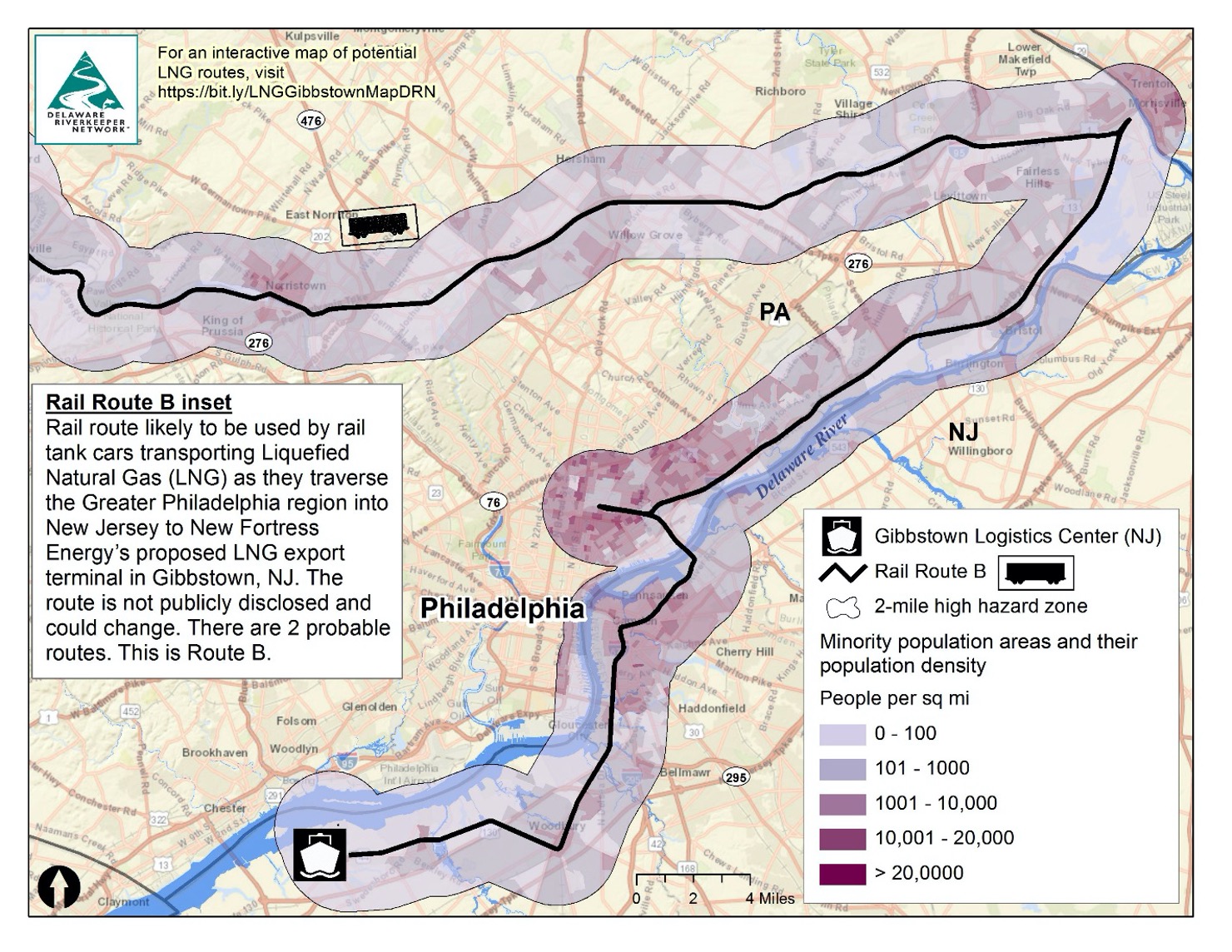 Figure 5. Rail Route A passes within 2 miles of a population of 1,649,638. 29% (477,816 individuals) are minorities, and 24% (392,577 individuals) are low income, according to 2010 US Census data compiled by the Environmental Protection Agency as part of their EJSCREEN program. Map made by FracTracker Alliance and published by Delaware Riverkeeper Network.