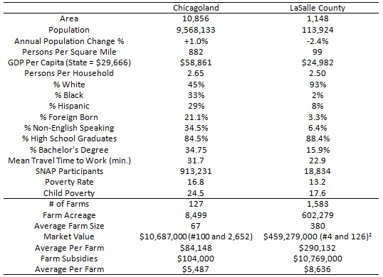 Chicagoland encompasses nearly 10,900 square miles – 9.5 times the area of Lasalle County. While Chicago’s population is expanding by 95,681 people per year, LaSalle’s is shrinking by 2,734 per year (Table 1). Chicagoans, though not South Siders, are making more than two times that of LaSalle County residents (with the latter actually falling nearly $4,700 below the state average). Predictably the demographics of Chicago reflect more and more those of the US, while LaSalle is typical of rural America with a population that is 93% white and only 3.3% foreign born. Thirty-five percent of Chicagoans are likely to achieve a bachelor’s degree, while only 16% of LaSalle County residents are likely to do so. Rates of poverty and more specifically child poverty, on the other hand, are significantly higher in Chicago. Finally, LaSalle is one of the country’s preeminent farming counties; it ranks #4 in the state and #126 nationally thanks to the value of agricultural commodities produced amounting to $448.5 million net of farm subsidies. See Table 1.