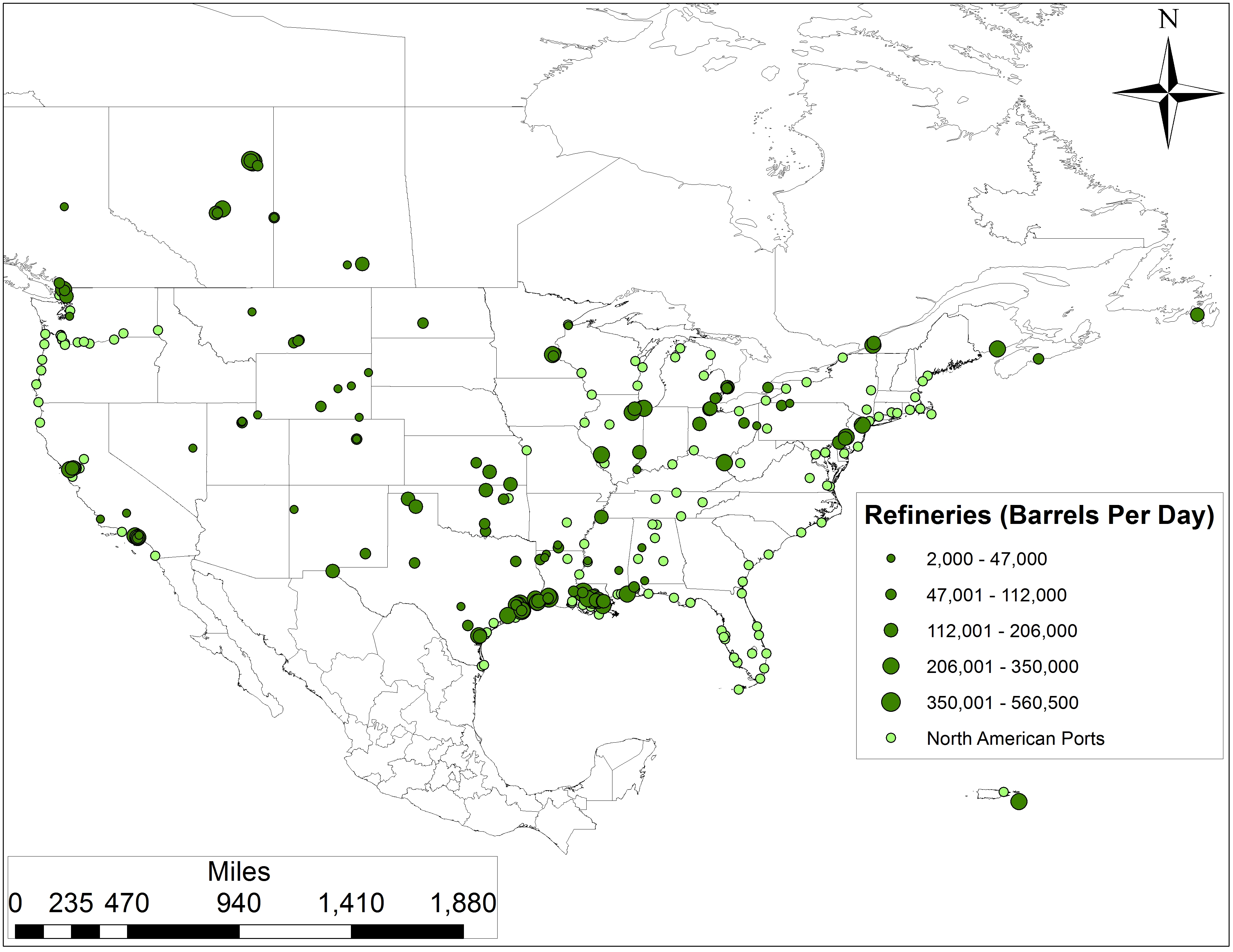 Figure 2. Average daily oil refinery production per day across North America’s 152 Oil Refineries along with North American ports.