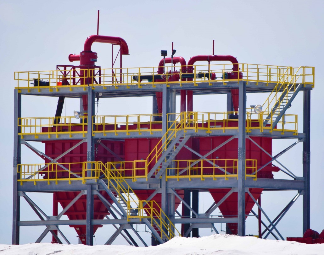 It was here that I photographed the mine’s reclamation plots, active mine pits, and developing water transport mechanisms. However, more importantly it was from here that I noticed off in the distance a bright red silica sand grain-size separator.