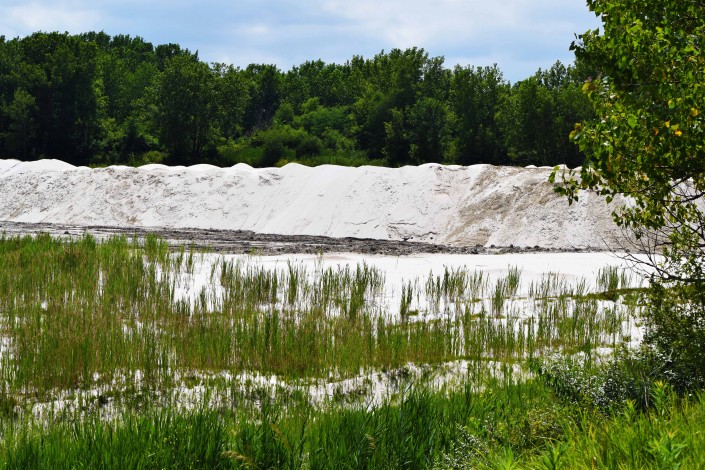 The above contrast was made crystal clear as I traveled down Interstate 80 westbound towards exit 90 and LaSalle’s County seat Ottawa (pop. 18,562). Upon arriving in Ottawa I drove west on Madison Street to the first target of our expedition: U.S. Silica Company’s mine and processing facility at the corner of Madison Boyce Memorial Drive. Upon arriving, however, it became clear that I would not find a suitable location to photograph the company’s mine; the perimeter had been fenced off and mounded up to the tune of 10-15 feet. So I got back in our rental car and drove to the mine’s southern perimeter adjacent to the Bear Den Bar and Grill and the Vine St.-Fern St.-15th Ave. neighborhood where there was clear line of site. It was here that I got some of the best photos of the mine’s scale and scope with respect to land-use, reclamation, and hydrology.