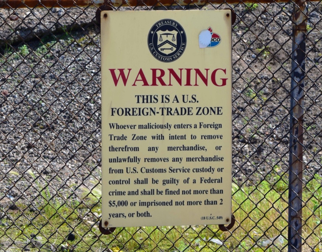 Figure 4. Photo of US Treasury Department signage outlining the warning associated with BP’s Whiting, IN, oil refinery designated a Foreign Trade Zone (FTZ). Photo by Ted Auch July 15th, 2015