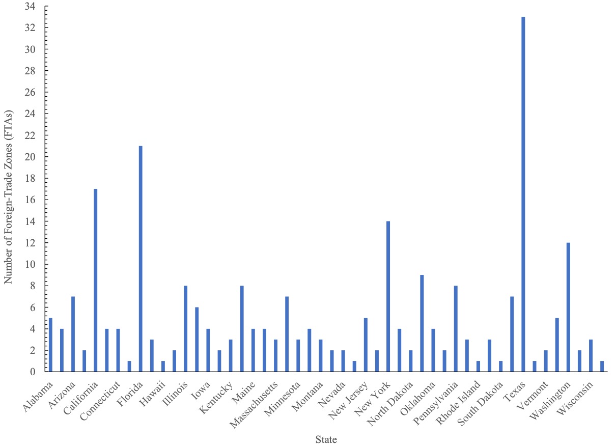 Figure 1. Number of Foreign-Trade Zones (FTZ) by state as of June 2020.