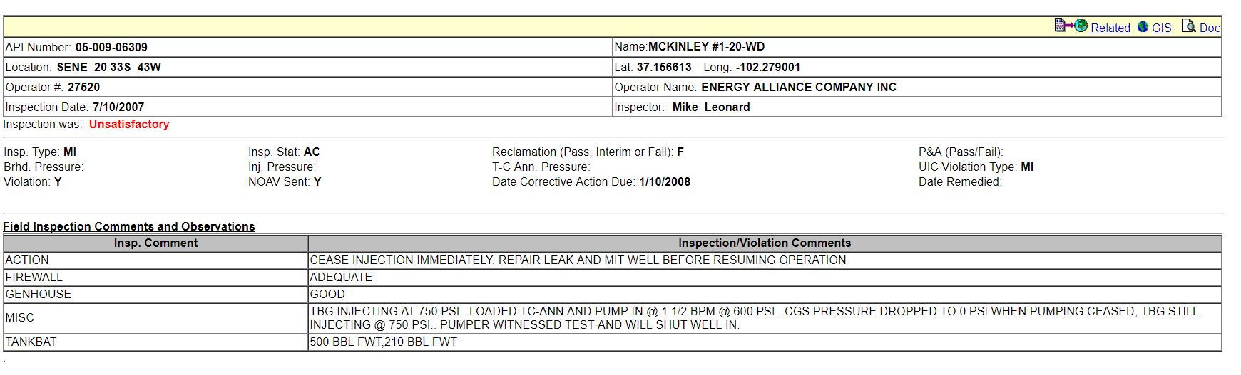 We also uncovered a situation where a disposal well caused groundwater contamination. Well records for Class II injection wells in the southeast corner of Colorado were reviewed in response to significantly high readings of TDS values in groundwater wells surrounding the Mckinley #1-20-WD disposal well.