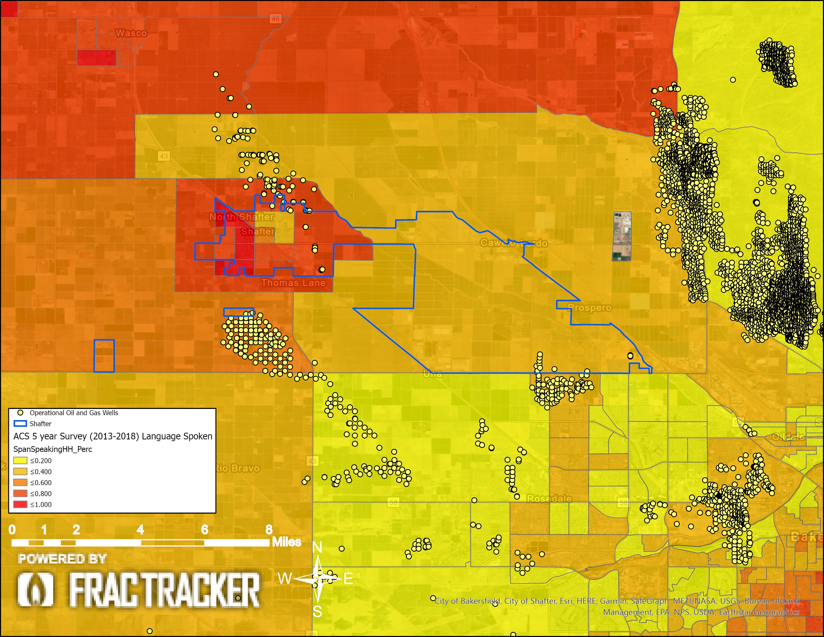 Access to information is vital for representation. Without representation, communities have no power over their autonomy. Kern County’s Frontline Communities are denied this basic, but absolutely vital right. According to the U.S. Census, over 51% of Kern County is Hispanic, and the maps below show that the demographics of the Frontline Communities in these cities are regularly between 80 – 100% Hispanic. Additionally, the maps illustrate that the households in these communities are majority Spanish-speaking households, many with limited English proficiency (all persons aged five and older reported speaking English less than “very well”). Yet Kern County regulators only provide information, notices, and other materials in English. This linguistically segregates power in Kern County, limiting Spanish-speaking Kern residents and citizens from participating in local decision-making processes.