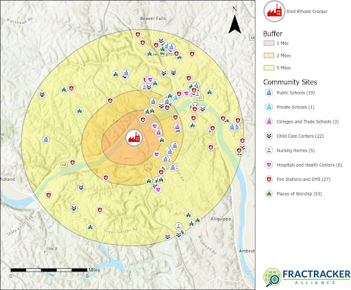 Notably, Shell Polymers Monaca is surrounded by EJ communities, and there are many sensitive community sites located nearby. Within five miles of the petrochemical complex there are 20 schools, 3 colleges and trade schools, 22 child care centers, 5 nursing homes and assisted living facilities, 6 hospitals/medical centers, 27 Fire Stations/EMS locations, and 53 places of worship.