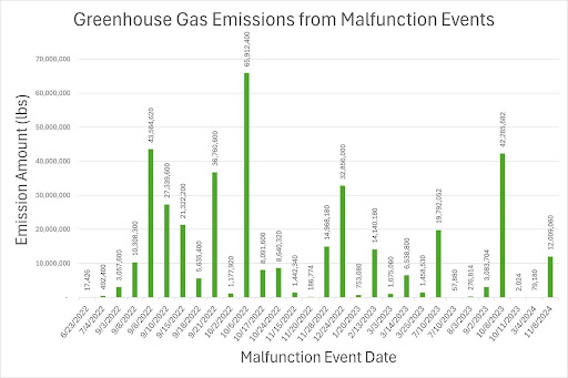 Figure 1. Greenhouse Gas Emissions (CO2e) from Malfunction Events. According to available malfunction reports, 30 malfunction events released approximately 383.3 million pounds (191,663 tons) of greenhouse gases into the surrounding environment between 2022 and 2024.
