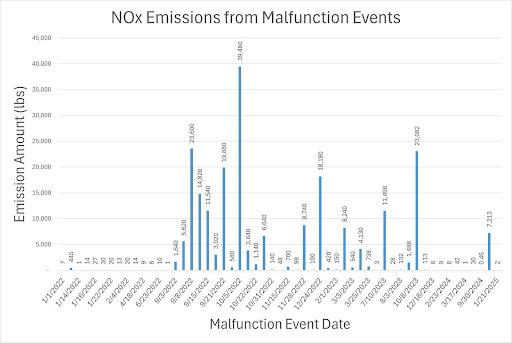 Figure 2. NOx Emissions from Malfunction Events. According to available malfunction reports, NOx is the most frequently emitted pollutant as a result of malfunctions, amounting to approximately 218,300 pounds of emissions during 55 events.