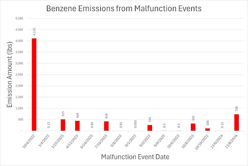Figure 3. Benzene Emissions from Malfunction Events. According to available malfunction reports, 15 malfunction events have released approximately 6,926 pounds of benzene into the surrounding environment.