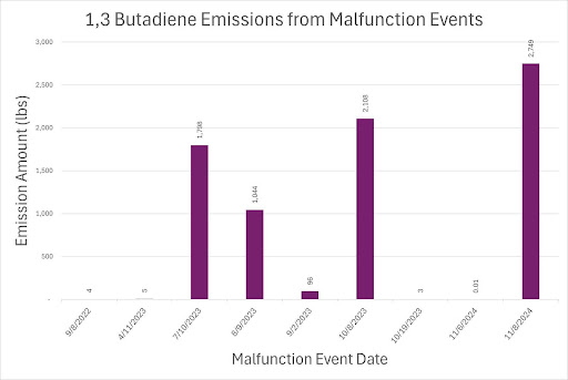 Figure 4. 1,3 Butadiene Emissions from Malfunction Events. According to available malfunction reports, nine malfunction events have released approximately 7,807 pounds of 1,3 butadiene into the surrounding environment.