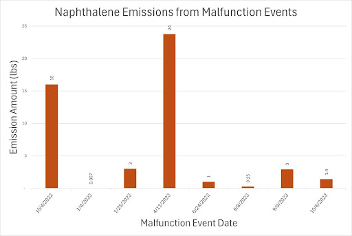 Figure 5. Naphthalene Emissions from Malfunction Events. According to available malfunction reports, eight malfunction events have released approximately 48 pounds of naphthalene into the surrounding environment.