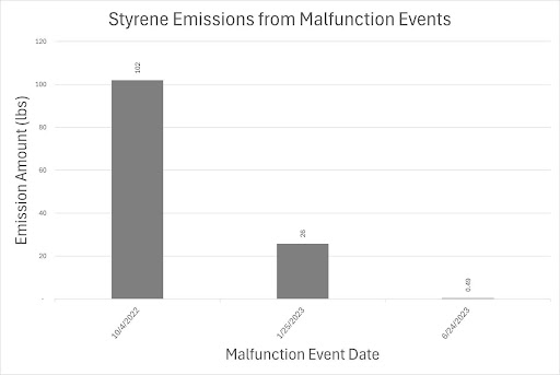 Figure 6. Styrene Emissions from Malfunction Events. According to available malfunction reports, three malfunction events have released approximately 128 pounds of styrene into the surrounding environment.