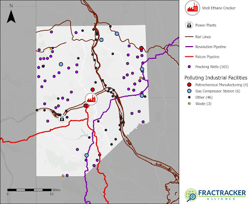 Additionally, Shell Polymers Monaca is not the only polluting facility in Beaver County. There are also two power plants (a nuclear power plant and a natural gas fired power plant that is associated with the Shell Plant), 6 compressor stations, 4 petrochemical manufacturing facilities, and 165 drilled fracking wells, the Falcon and Revolution Pipelines, and miles of railroads that stretch along the Ohio and Beaver Rivers. All of these sources of emissions together result in a large pollution burden for the people that live nearby.