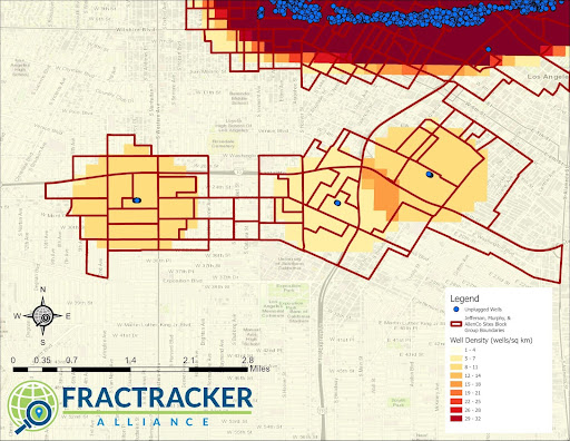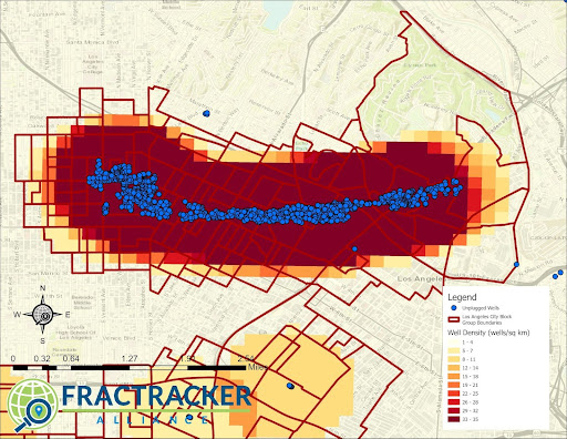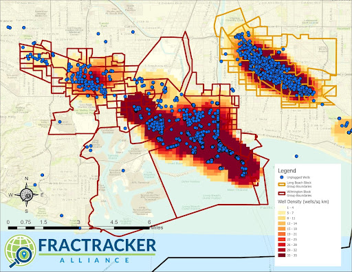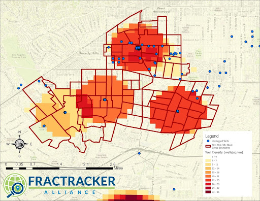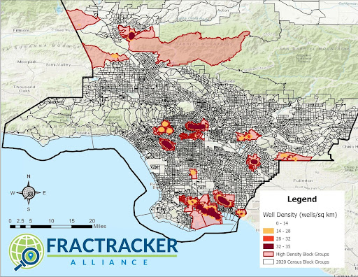 Los Angeles communities located near dense oil and gas extraction (14+ wells per km2) also had elevated levels of poverty, higher proportions of non-white demographics, and were at greater risk of exposure to additional sources of pollution.