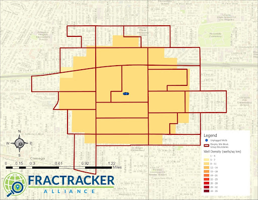 We used the ArcGIS Point Density tool to create a raster dataset of unplugged well density across Los Angeles County. We sourced well location data from the California Geologic Energy Management Division. We overlaid this raster dataset with Los Angeles CBG boundaries and CBGs were manually selected based on two criteria: (1) the presence of high well density and/or (2) the known location of wells, unplugged or plugged, in the area. The CBGs identified as impacted by high densities of oil and gas wells are shown in the maps below, outlined in red, and can be considered case populations. Comparisons between the impacted CBGs (case populations) and the rest of Los Angeles County (control populations) are discussed for each site. When discussing the rest of Los Angeles County, we define the control population as the CBGs that do not contain high well densities, countywide.