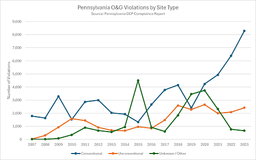 Figure 3. Pennsylvania oil and gas violations by site type from 2007 to 2023.