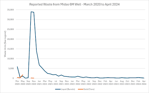 Because the well was completed in October 2020, we started the production analysis in that month. However, the completion process comes after the drilling, which started in March of that year, so the waste analysis goes back a few months further. In 50 months of operation, this single well has reported generating 127,893 barrels (5.4 million gallons) of liquid waste, and 2,610 tons (5.2 million pounds) of solid waste.