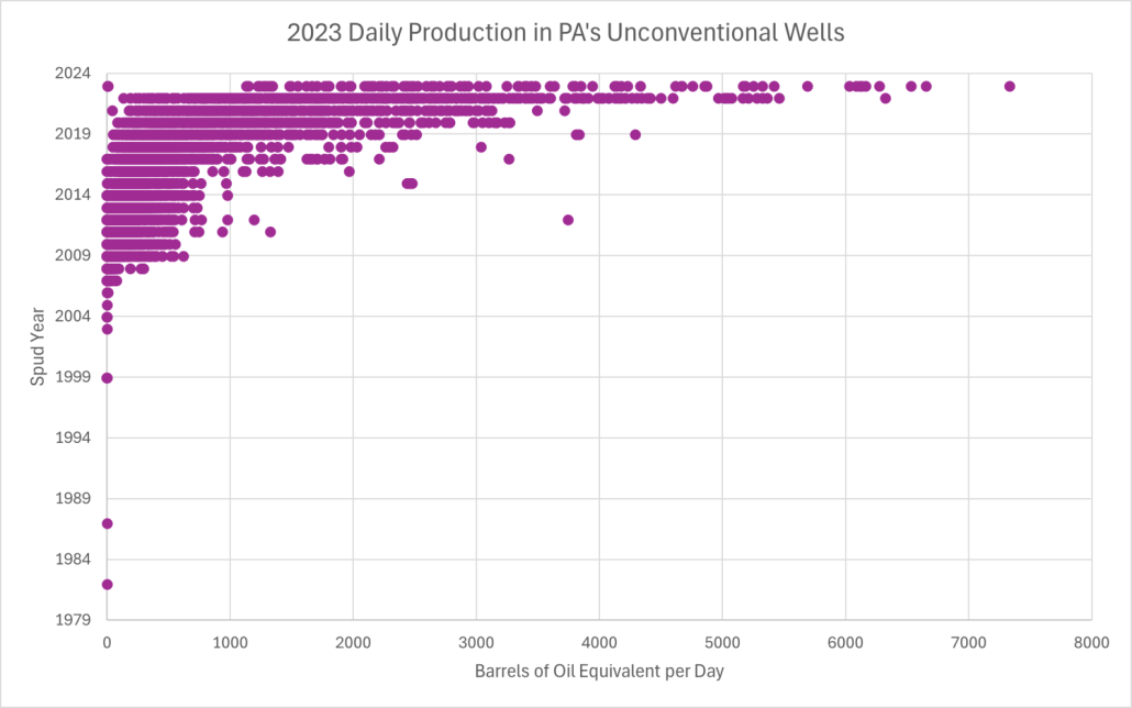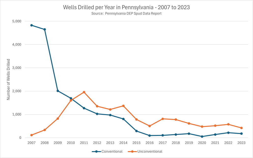 Operators drilled 33,069 wells in Pennsylvania between 2007 and 2023, including 14,380 unconventional wells.