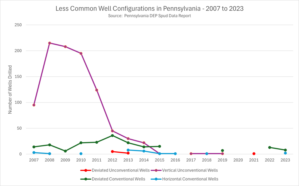 Deviated unconventional wells are relatively rare, with just nine wells (0.06%) of this type in the 17 years between 2007 and 2023. Deviated conventional wells are more common, with 198 such wells, but this still only amounts to about 1% of all conventional wells drilled during this time. In as much as deviated drilling could ever have been considered a fad in Pennsylvania, it seemed to go out of fashion after 2015 before seeing a bit of a resurgence in 2022 and 2023. Finally, operators have drilled 24 horizontal wells into conventional formations, or about 0.1% of conventional wells drilled in the time frame.