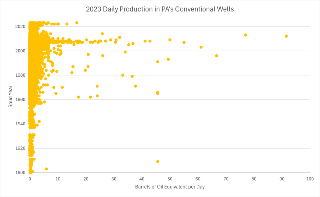 As we saw above, drilling for new unconventional wells in Pennsylvania peaked in 2011 with 1,958 new wells, while in 2023, the industry drilled less than one quarter of that amount, with just 421 such wells. However, the total production remains high.